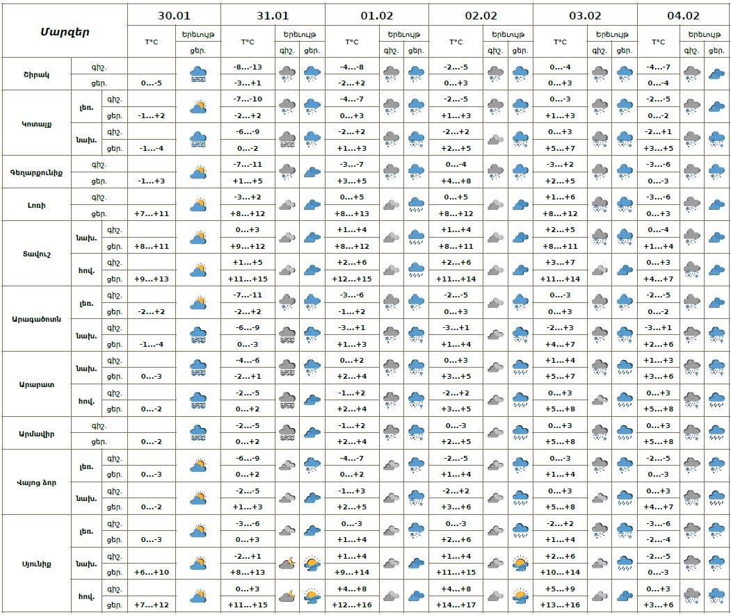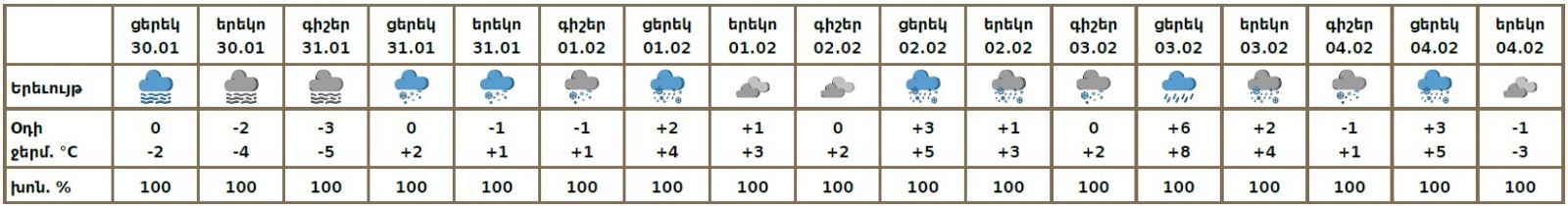 Հունվարի 30-ի ցերեկը սպասվում է առանց տեղումների եղանակ։ Հունվարի 31-ին, փետրվարի 1-4-ին առանձին շրջաններում սպասվում են տեղումներ, նախալեռնային և հովտային շրջաններում՝ ձնախառն անձրևի, լեռնային շրջաններում ձյան տեսքով, լեռնային առանձին շրջաններում՝ բուք, ցածր հորիզոնական տեսանելիություն։