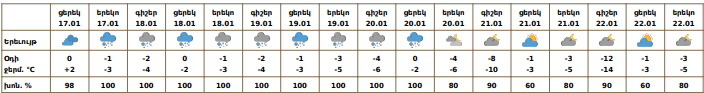Հունվարի 17-ի երեկոյան, 18-20-ին սպասվում է ձյուն։ Հունվարի 21-22-ին սպասվում է առանց տեղումների եղանակ: