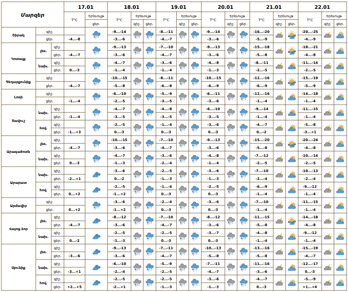 Հունվարի 17-ի ցերեկն առանձին շրջաններում, 17-ի ուշ երեկոյան, 18-20-ին շրջանների մեծ մասում սպասվում է ձյուն, լեռնային առանձին վայրերում՝ բուք, ցածր հորիզոնական տեսանելիություն։ Հունվարի 21-22-ին սպասվում է առանց տեղումների եղանակ։ Քամին` հարավարևմտյան 2-5մ/վ։ Օդի ջերմաստիճանը հունվարի 18-19-ին գիշերային ժամերին աստիճանաբար կբարձրանա 5-8 աստիճանով։