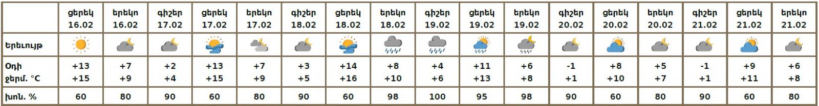 Փետրվարի 16-ի ցերեկը, 17-ին, 18-ի գիշերը, 20-21-ին սպասվում է առանց տեղումների եղանակ։ Փետրվարի 18-ի ուշ երեկոյան, 19-ին սպասվում է անձրև: