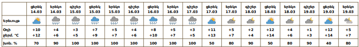 Մարտի 17-ի գիշերն առանձին շրջաններում, 15-16-ին`շրջանների մեծ մասում սպասվում են տեղումներ, լեռնային գոտիներում՝ ձյան, նախալեռնային և հովտային գոտիներում՝ ձնախառն անձրևի և անձրևի տեսքով։ Մարտի 15-16-ին առանձին հատվածներում տեղումները կլինեն զգալի։ Լեռնային շրջաններում սպասվում է նաև բուք, ցածր հորիզոնական տեսանելիություն, ավտոճանապարհներին՝ մերկասառույց։ Մարտի 17-ի ցերեկը, 18-19-ին սպասվում է առանց տեղումների եղանակ։ Քամին`հյուսիսարևելյան` 2-5 մ/վ։ Օդի ջերմաստիճանը մարտի 15-16-ին գիշերն աստիճանաբար կբարձրանա ևս 3-6 աստիճանով։