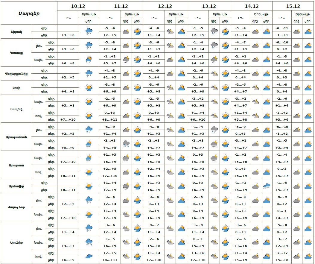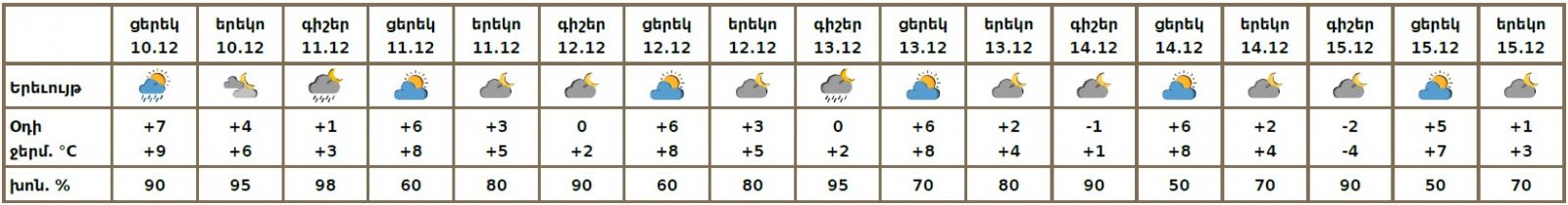 Դեկտեմբերի 10-ի ցերեկը, 11-ի գիշերը, 12-ի ուշ երեկոյան, 13-ի գիշերն առանձին շրջաններում սպասվում են թույլ տեղումներ ՝ լեռնային շրջաններում ձյան և ձնախառն անձրևի, հովտային շրջաններում՝ անձրևի տեսքով։ Դեկտեմբերի 11-ի ցերեկը, 12-ին, 13-ի ցերեկը, 14-15-ին սպասվում է առանց տեղումների եղանակ։ Դեկտեմբերի 11-14-ին Արարատյան և Շիրակի դաշտի ցածրադիր հատվածներում առավոտյան ժամերին սպասվում է մառախուղ։ Քամին արևմտյան՝ 2-5մ/վ, դեկտեմբերի 13-ին, 14-ի գիշերն առանձին շրջաններում սպասվում է քամու ուժգնացում՝ 14-18մ/վ արագությամբ։ Օդի ջերմաստիճանն էապես չի փոխվի։