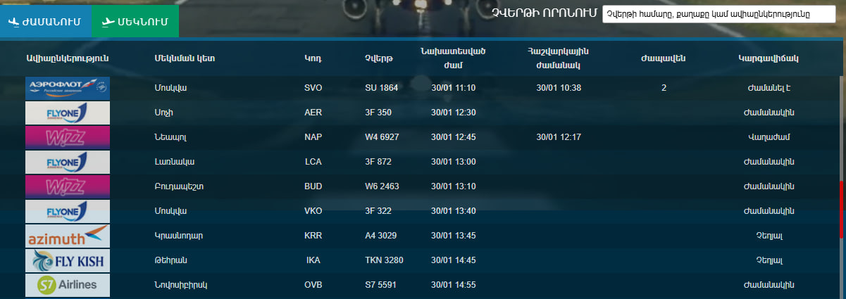«Ազիմուտ» ավիաընկերության Կրասնոդար-Երևան չվերթը չեղարկվել է, «Զվարթնոց» միջազգային օդանավակայանի առցանց չվացուցակի տվյալներ են հրապարակվել։