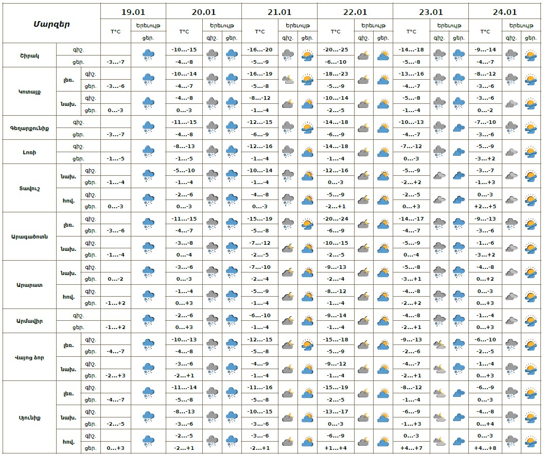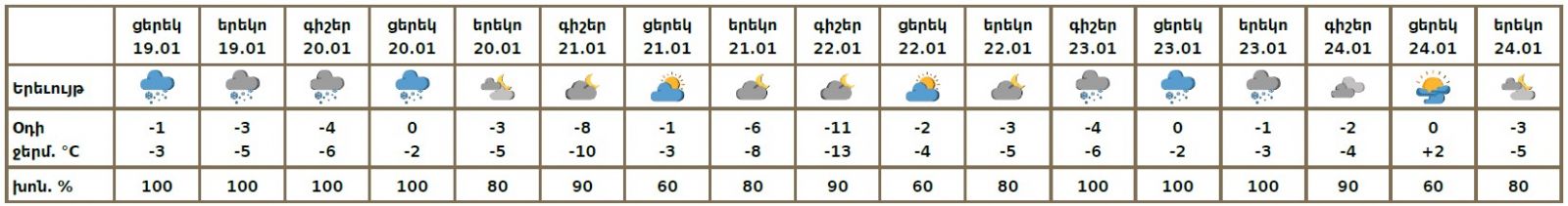 Հունվարի 19-ի ցերեկը, 20-ին, 23-ին սպասվում է ձյուն։ Հունվարի 21-22-ին, 24-ին սպասվում է առանց տեղումների եղանակ: