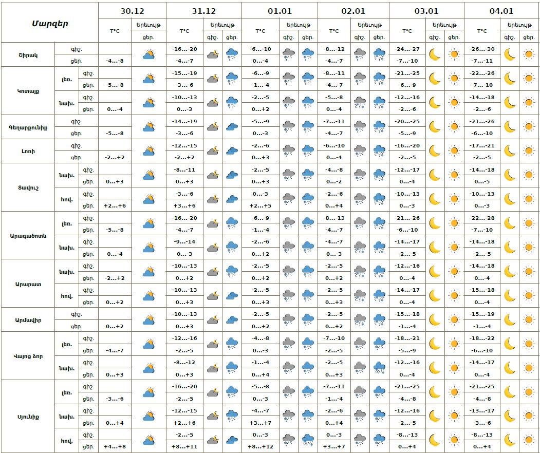 Դեկտեմբերի 31-ի գիշերը, հունվարի 3-4-ին սպասվում է առանց տեղումների եղանակ։Դեկտեմբերի 31-ի ցերեկը, հունվարի 1-2-ին շրջանների զգալի մասում սպասվում է ձյուն, լեռնային մարզերում բուք, ցածր հորիզոնական տեսանելոիություն։ Դեկտեմբերի 30-ի լույս 31-ի գիշերը և առավոտյան ժամերին հանրապետության բոլոր ավտոճանապարհներին սպասվում է մերկասառույց։