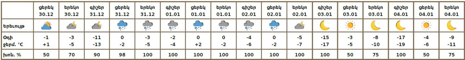 Դեկտեմբերի 31-ի գիշերը, հունվարի 3-4-ին սպասվում է առանց տեղումների եղանակ: Դեկտեմբերի 31-ի ցերեկը, հունվարի 1-2-ին սպասվում է ձյուն: