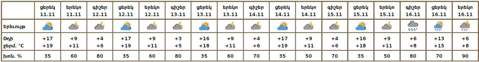 Նոյեմբերի 11-ի ցերեկը, 12-15-ին սպասվում է առանց տեղումների եղանակ։ Նոյեմբերի 16-ին սպասվում է անձրև։