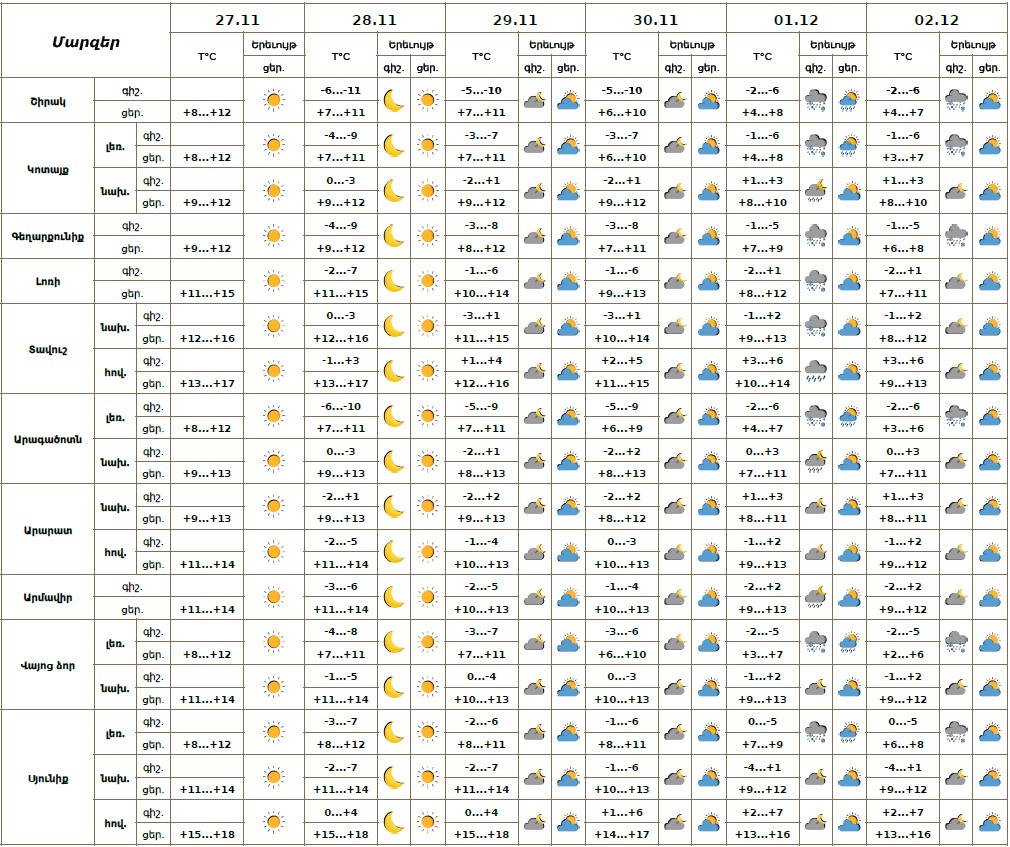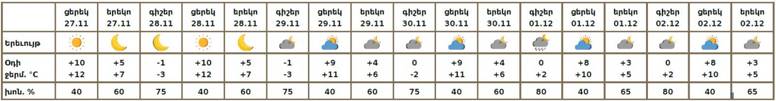 Նոյեմբերի 27-ի ցերեկը, 28-30-ին, դեկտեմբերի 2-ին սպասվում է առանց տեղումների եղանակ։ Դեկտեմբերի 1-ի գիշերն սպասվում է անձրև։