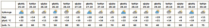 Հոկտեմբերի 25-ի ցերեկը, 27-28-ին և 30-ին սպասվում է առանց տեղումների եղանակ։ Հոկտեմբերի 26-ի և 29-ի ցերեկը սպասվում է կարճատև անձրև։