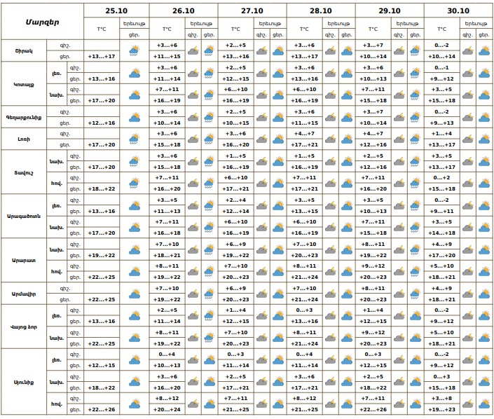 Հոկտեմբերի 25-ի, 26-ի և 29-ի ցերեկն առանձին շրջաններում սպասվում է կարճատև անձրև։ Հոկտեմբերի 27-28-ին և 30-ին սպասվում է առանց տեղումների եղանակ: Քամին արևմտյան՝ 2-5մ/վ: Օդի ջերմաստիճանն էապես չի փոխվի։