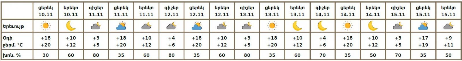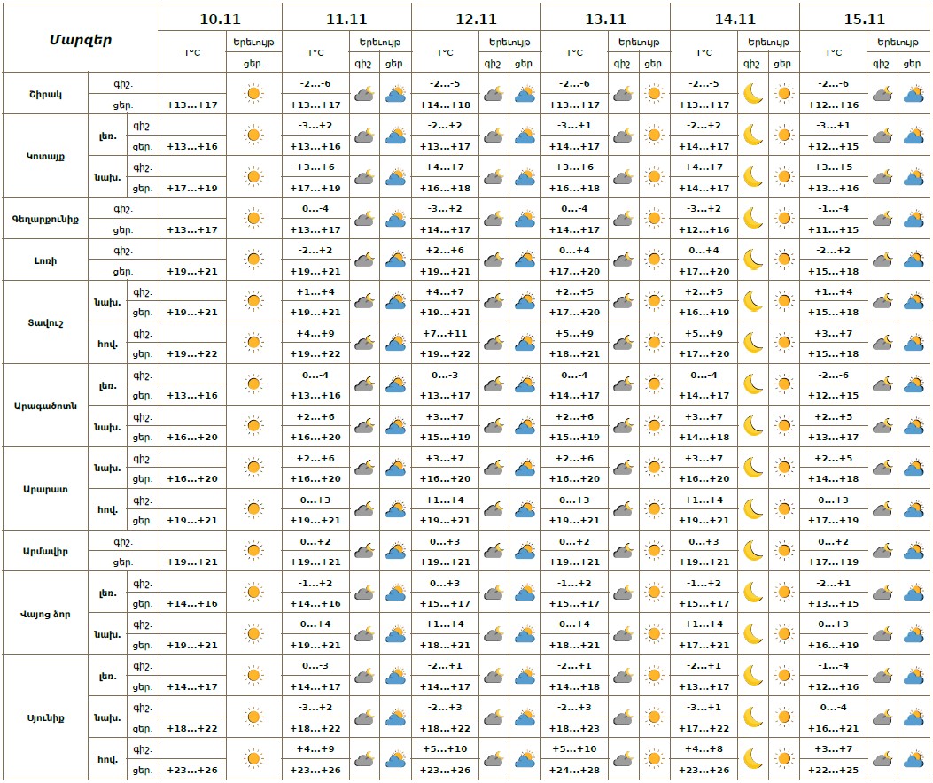 Նոյեմբերի 10-ի ցերեկը, 11-15-ին սպասվում է առանց տեղումների եղանակ: Քամին հարավարևմտյան՝ 2-5մ/վ: Օդի ջերմաստիճանն էապես չի փոխվի։